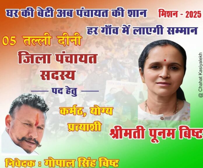 नैनीताल ।तल्ली दीनी 05 से जिला पंचायत सदस्य पूनम बिष्ट के चुनावी मैदान में उतरने से मची हलचल ।पंचायत चुनाव में लगातार दावेदारी से गाँवो में भी हलचल है। चुनावी रण में महासंग्राम का इंतजार बाकी रह गया है। सभी मैदान फते करने के लिए तैयार है।