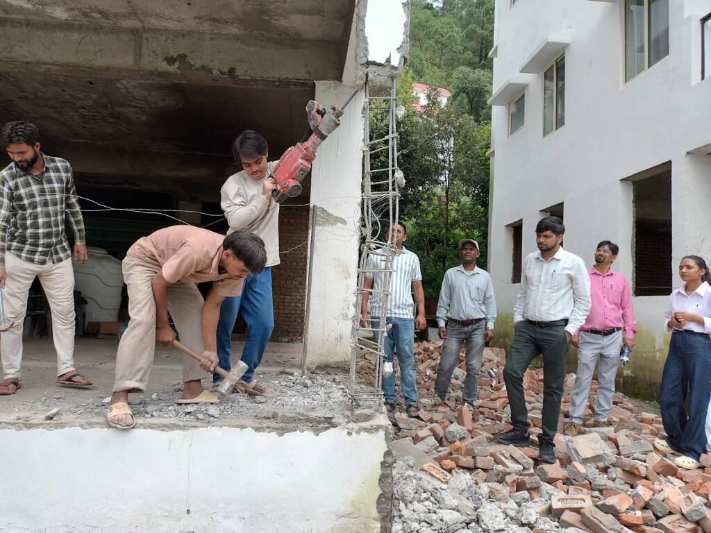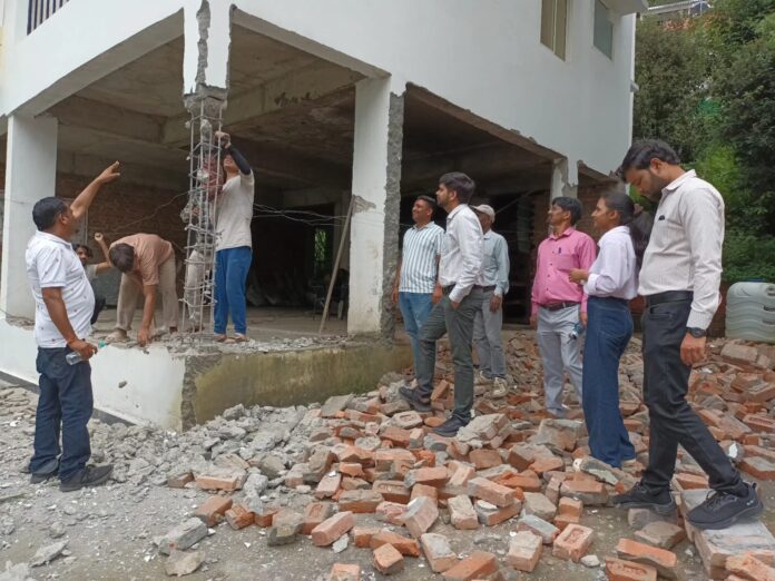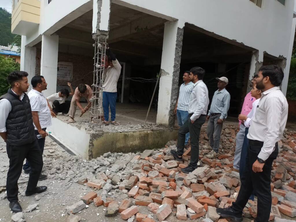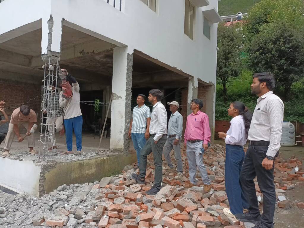 भवाली: शहर के श्यामखेत क्षेत्र में अवैध अतिक्रमणकारियों पर प्राधिकरण का हथौड़ा चला। प्राधिकरण टीम ने मशीनों और मजदूरों की मदद से अतिक्रमण तुड़वाया। अतिक्रमणकारी ने स्वीकृत नक्शे से बढ़ाकर चार मंजिला भवन का निर्माण किया था।