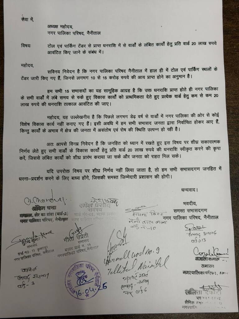 <span;>नैनीताल।नगर पालिका में लंबे समय से रुके हुए विकास कार्यों को लेकर सभासदों ने अब एकजुट होकर अपनी आवाज बुलंद की है। नगर के सभी 15 सभासदों ने सामूहिक रूप से एक मांग पत्र सौंपकर टोल एवं पार्किंग टेंडर से प्राप्त होने वाली धनराशि में से प्रत्येक वार्ड को 20 लाख रुपये आवंटित करने का आग्रह किया है।